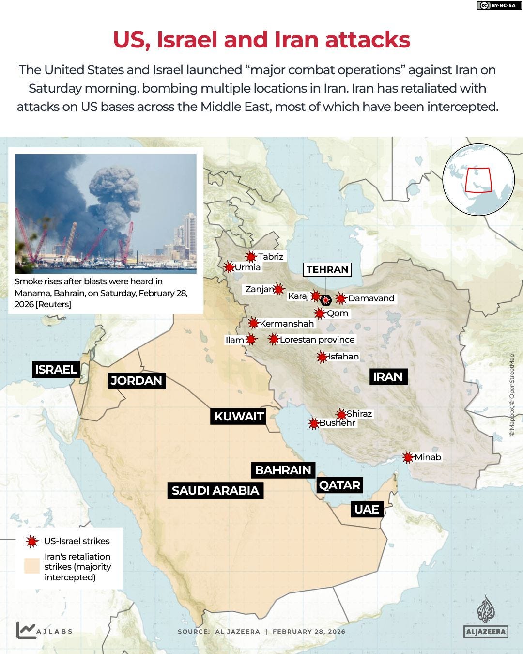 巴林(Bahrain): 经证实的爆炸声震动了首都麦纳麦(Manama)的朱费尔区(Juffair),即第五舰队司令部所在地。由于美方设施面临威胁,巴林内政部疏散了朱费尔区的居民;同时,美国驻巴林和驻卡塔尔大使馆均对其人员和公民发布了严厉的“就地避难(Shelter-in-Place)”指令。
